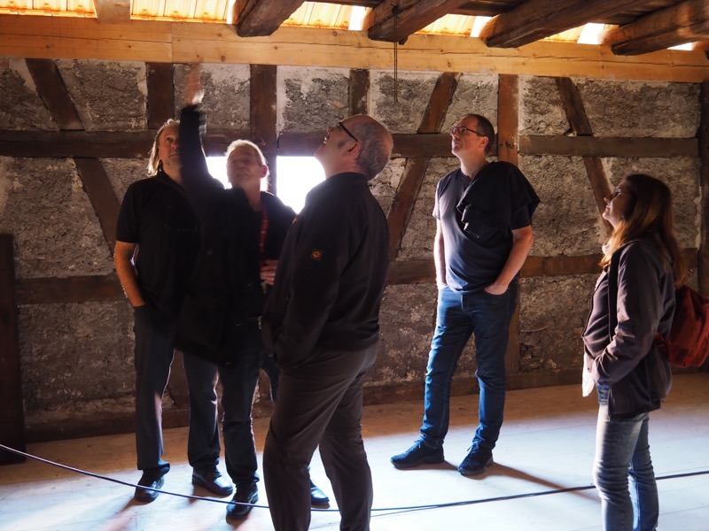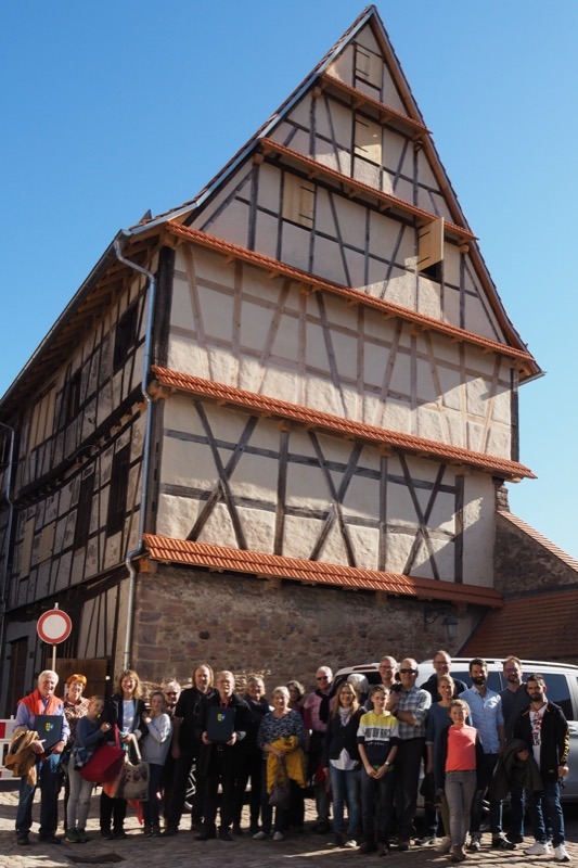 Zu den Gernsbachern Zehntscheuern führte unser diesjähriger Vereinsausflug am vergangenen Samstag. Die beiden nebeneinander stehenden Gebäude von imposanter Höhe wurden 1694 und 1701 errichtet, das Erdgeschoss stammt jedoch aus dem Mittelalter. Zu den Zehntherren zählten der Speyrer Bischof und die Kirche von Rothenfels. Im Unterschied zur Altenbürger Zehntscheuer wurden die oberen Stockwerke der Gernsbacher Gebäude mit traditionellem Fachwerkbau errichtet, die Ausfachung mit Stacken, Flechtwerk, Lehm und Stroh ist noch an vielen Stellen sichtbar. Die Mitglieder des “Forum Gernsbacher Zehntscheuern e.V.” führten uns durch ihr gerade erst renoviertes Schmuckstück und gaben Ausblick auf weitere Ziele. Trotz Unterschiede in der Bauweise konnten wir zahlreiche Anregungen und Ideen mit nach Hause nehmen. Ein besonderer Dank geht an Maria Brandes für die tolle Organisation des Ausflugs!