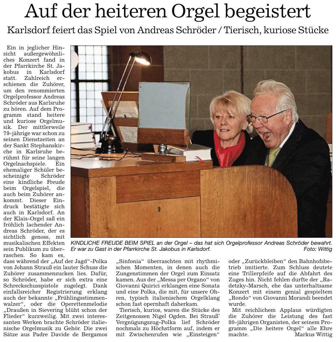 Wie vielseitig eine Kirchenorgel als Instrument ist, bewies Prof. Andreas Schröder beim Konzert “Die heitere Orgel” am vergangenen Sonntag. “Das Erbe der Wiener Klassik” ließ er mit Haydn, Beethoven und Schubert aufleben, bevor er einen “Gruß aus Italien” mit de Bergamo und Quirici intonierte. Mit dem Briten Nigel Ogden begaben sich die über 100 Zuhörer auf die Spur des weißen Kaninchens zu Alice ins Wunderland und hörten einen verspielten Pinguin daherwatscheln. Zurück ging es nach Wien zu Johann Strauß, wo der Kirchenmusikdirektor a.D. in der Vergnügungszug-Polka sogar eine Trillerpfeife einsetzte und mit Rufen wie “Zusteigen, bitte!” die gelöste Atmosphäre bereicherte, während bei der Polka “Auf der Jagd” sogar ein Schuss ertönte. Mit einem letzten Ausflug nach Italien zu Morandi endete ein abwechslungsreiches und humorvolles Programm. Ein Umtrunk zum Abschluss rundete die Veranstaltung gemütlich ab.