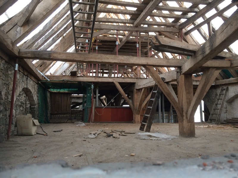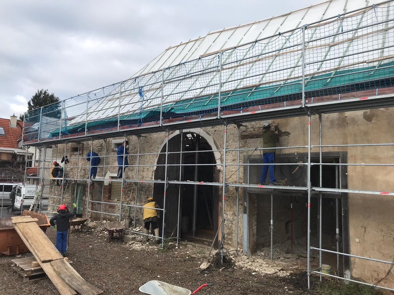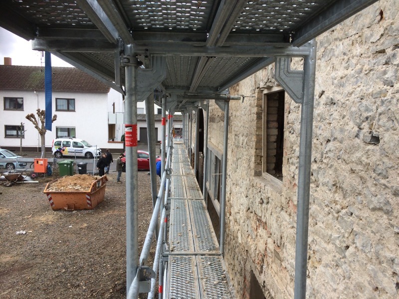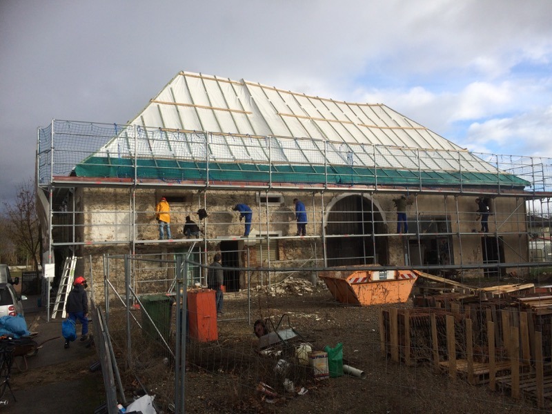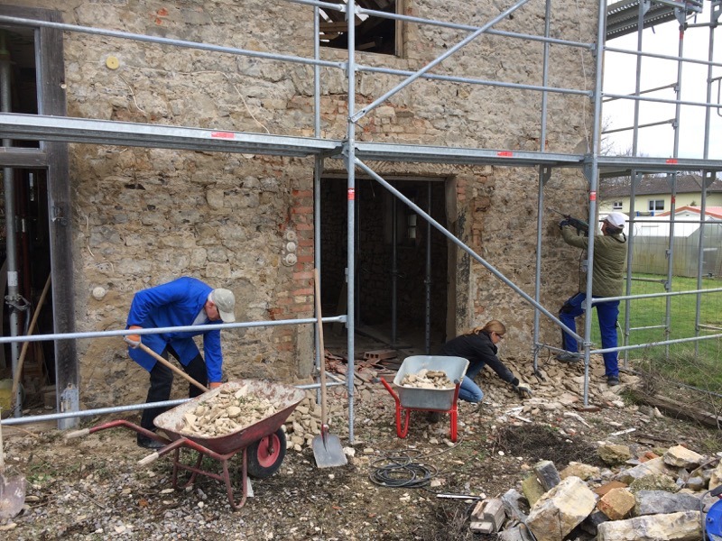 Ein Blick auf die Mulde sagt eigentlich alles: Der heutige Arbeitseinsatz an der Zehntscheuer war ein voller Erfolg. 14 fleißige Helfer haben den Außenputz vollständig abgemeißelt, zusammengekehrt und verladen. Unser Bauteam überlegt, wie es weitergeht – so allmählich werden die Arbeiten speziell. Aber wir freuen uns, dass es so gut vorangeht.