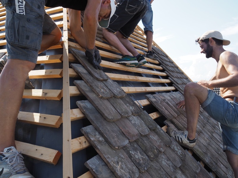“Mal sehen, wer kommt” – mit bescheidener Hoffnung begann der Versuch, in den Sommerferien die Arbeitseinsätze wöchentlich anzugehen. Doch trotz hochsommerlichen Temperaturen hatte sich jeden Samstag eine große Gruppe an Helfern eingefunden, viele zum ersten Mal. Ziegel abbürsten, stapeln, tragen, schneiden, legen, klammern: es gab viel zu tun – und es wurde viel getan!