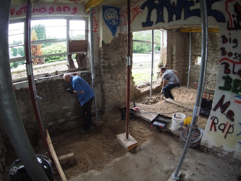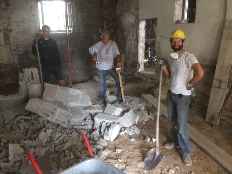 Erst war es draußen nass, dann drinnen staubig – aber am Ende war die Zehntscheuer wieder ein Stückchen schöner geworden. Wir haben Fugen ausgekratzt, Wände eingerissen und den Kamin zerbröselt, damit der Einsatz auch für die Mulde ein voller Erfolg war. Herzlichen Dank an alle Helfer und an Ulrike für die herzhafte Brotzeit!