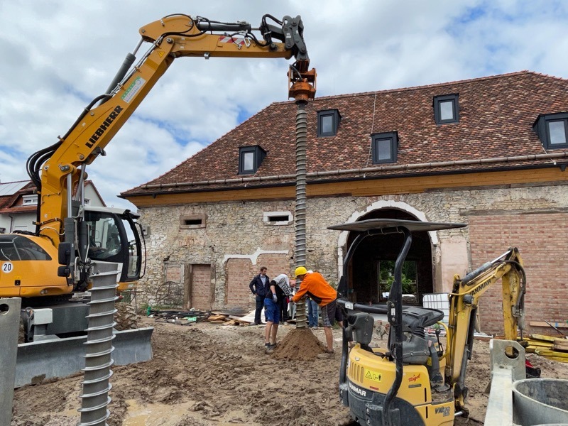 Wieder war schweres Gerät an der Zehntscheuer im Einsatz – aber was für eins! Die Firma Erdwärme Krämer aus Rußheim ging mit einem Spezialbohrer in die Tiefe, damit künftig niemand im historischen Gemäuer frieren muss. Acht 40 Meter tiefe Bohrlöcher wurden im Hof gebohrt und mit Rohren bestückt. Darin wird Wasser in der Tiefe auf 12 Grad erwärmt, ein Wärmetauscher bringt anschließend Wärme ins Gebäude.