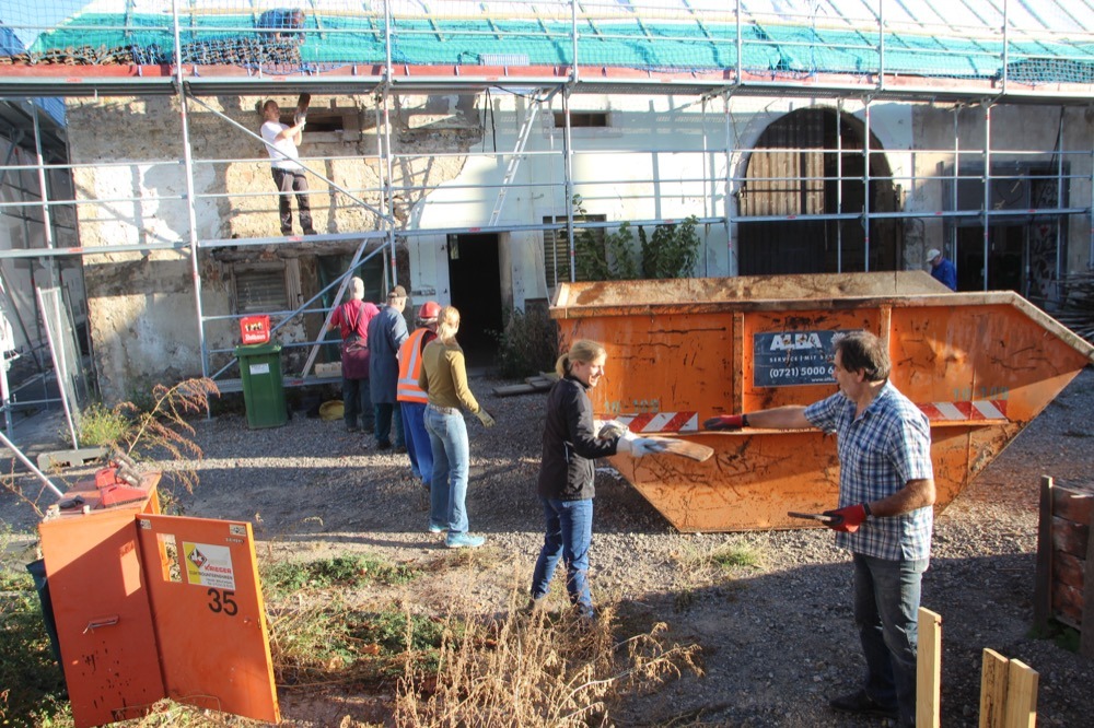 Rund 20 Helfer hatten sich beim letzten Arbeitseinsatz an der Zehntscheuer eingefunden. Einige waren das erste Mal dabei, um sich das Projekt mal aus der Nähe anzuschauen. Es ist einfach toll, wie schnell man vorankommt, wen so viele fleißige Hände mit anpacken. So konnten wir eine Kette bilden und die Ziegeln archivieren, die seit dem Abdecken noch auf de Gerüst lagerten. Auch das Altholz fand seinen Weg in die Mulde, nachdem zuvor die antiken, handgeschmiedeten Nägel daraus gerettet wurden. Da wir gut in der Zeit lagen, entfernten wir noch Mauerputz an einigen Stellen.