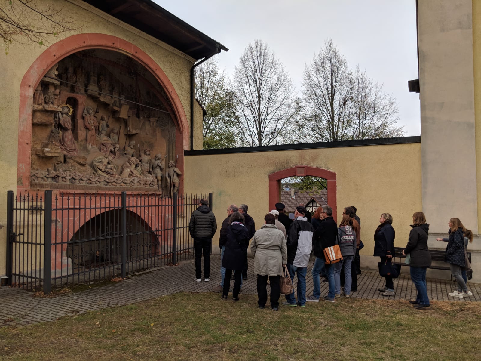 Über den beeindruckenden Ölberg neben der alten Kirche gelangten wir zum Firstständerhaus. Dort bekamen wir eine Führung aus erster Hand. Christian Mannek, 2. Vorsitzender des Heimatvereins, und Roland Pfenninger erläuterten die bauhistorischen Merkmale des Gebäudes. Besonders interessant war für uns, wie das Zeuterner Sanierungsprojekt organisiert war und wie es ablief. Wir erfuhren, dass die Gemeinde eine wichtige Rolle spielte und weiterhin spielt. Ihr gehört das Gebäude, sie kümmerte sich um die Einwerbung von Fördermitteln und beauftragte Architekt und Fachfirmen. Die Bürgerinitiative und der Heimatverein verpflichteten sich, Eigenleistungen zu übernehmen und so die Kosten zu senken.