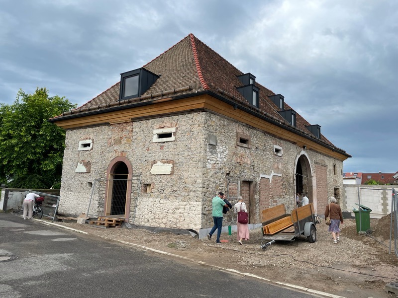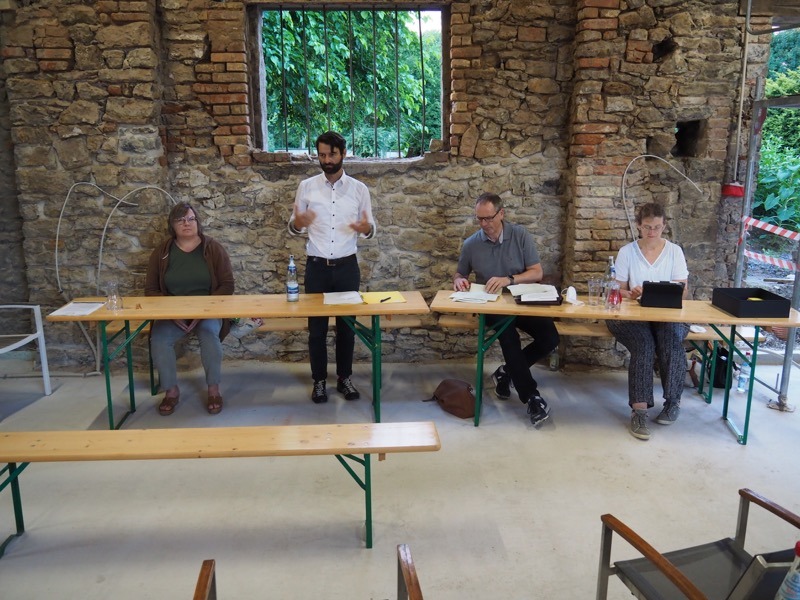 Die Jahreshauptversammlung der Bürgerstiftung Karlsdorf-Neuthard e.V. am 28. Juli 2021 war aus mehreren Gründen eine besondere Veranstaltung. Nicht nur, weil coronabedingt auf zwei Jahre zurückgeblickt werden musste, da im 2020 keine Mitgliederversammlung stattfinden konnte. Nicht nur, weil fast auf den Tag genau – am 3. August 2016 – der Verein sein fünfjähriges Bestehen feiern konnte. Vor allem war es die erste öffentliche Veranstaltung, die in der teilsanierten Zehntscheuer stattfinden konnte. Noch deutlich als Baustelle erkennbar mit rohem Betonboden, Gerüsten an den Seiten und teilverfugtem Mauerwerk entstand dennoch ein besonderes Ambiente, auch dank der von Dieter Schlindwein gestifteten Getränke. Die Mitglieder konnten mehr als nur eine Idee davon bekommen, wie es einmal aussehen wird.