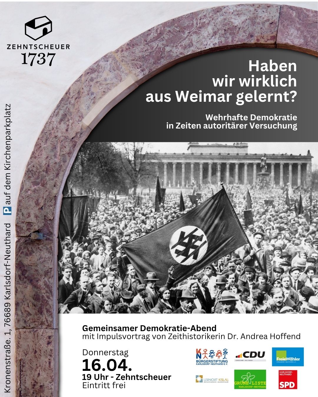 Haben wir wirklich aus Weimar gelernt? Wehrhafte Demokratie in Zeiten autoritärer Versuchung, Demokratie-Abend mit einem Impulsvortrag von Dr. Andrea Hoffend