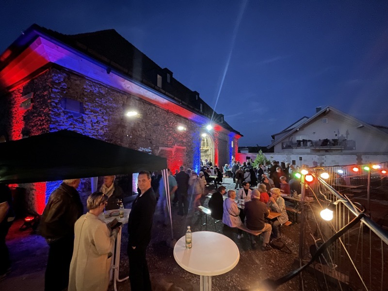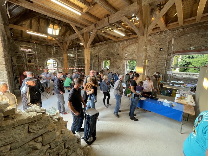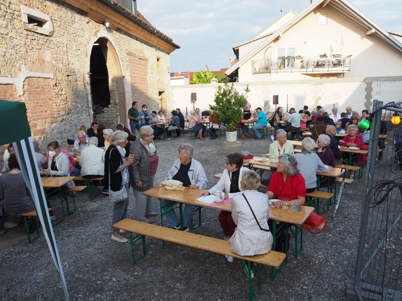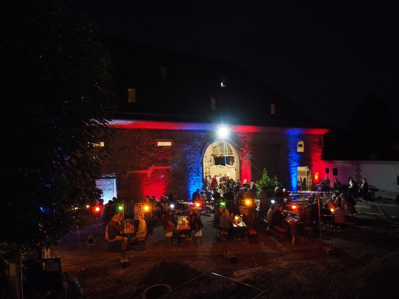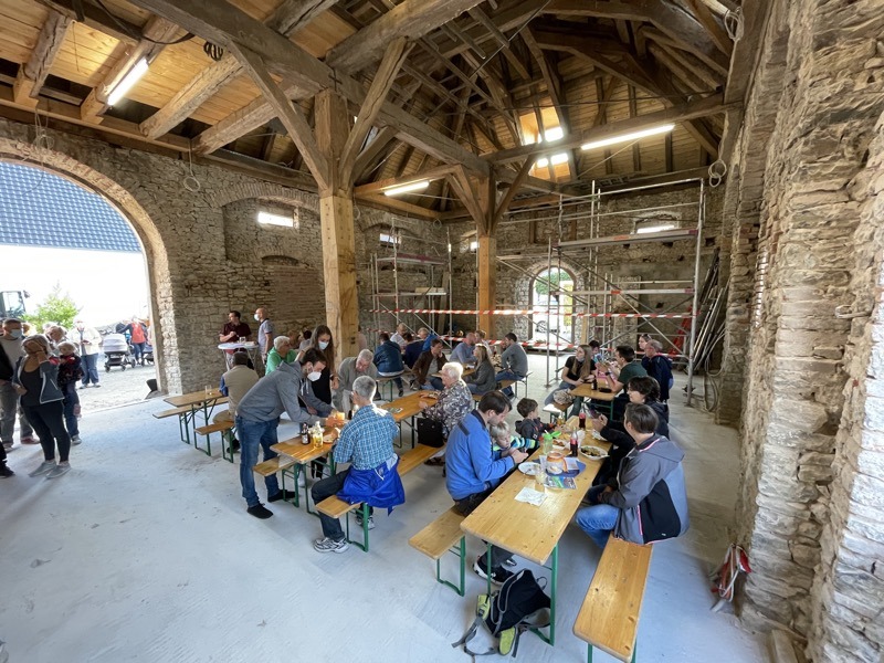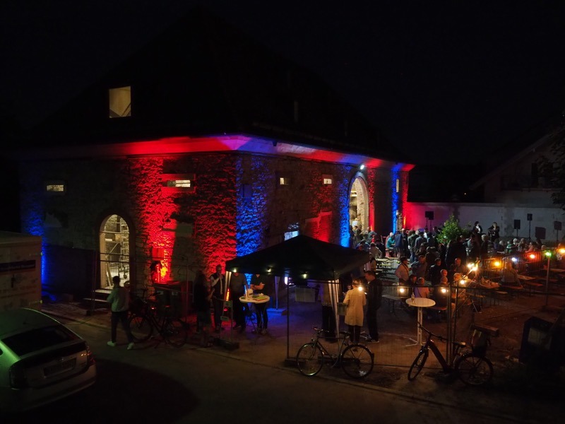 „Ja, ja und nochmal ja!“ waren die Antworten auf die wichtigsten Fragen vor unserem Zwiebelkuchenfest: Wird das Wetter halten? Lässt es die Corona-Lage zu? Und haben die Leute überhaupt Lust auf ein Fest? Der rege Zuspruch gestern ließ keine Zweifel zu, dass wir das Richtige zur richtigen Zeit gemacht haben. Das kulinarische Angebot von Zwiebelkuchen und neuem Wein, aber auch rustikale Brotvariationen oder die abwechslungsreichen Buddha-Bowls kamen wieder hervorragend an. Der laue Spätsommerabend lud förmlich dazu ein, im Hof vor der Zehntscheuer oder auch drinnen unter dem sanierten Gebälk den Baufortschritt am historischen Gebäude aus nächster Nähe zu betrachten. Als mit zunehmender Dunkelheit die Außenfassade bunt erstrahlte und die „Crazy Schuhs“ unplugged mit ihren Rock- und Popklassikern loslegten, war die Atmosphäre geradezu magisch.